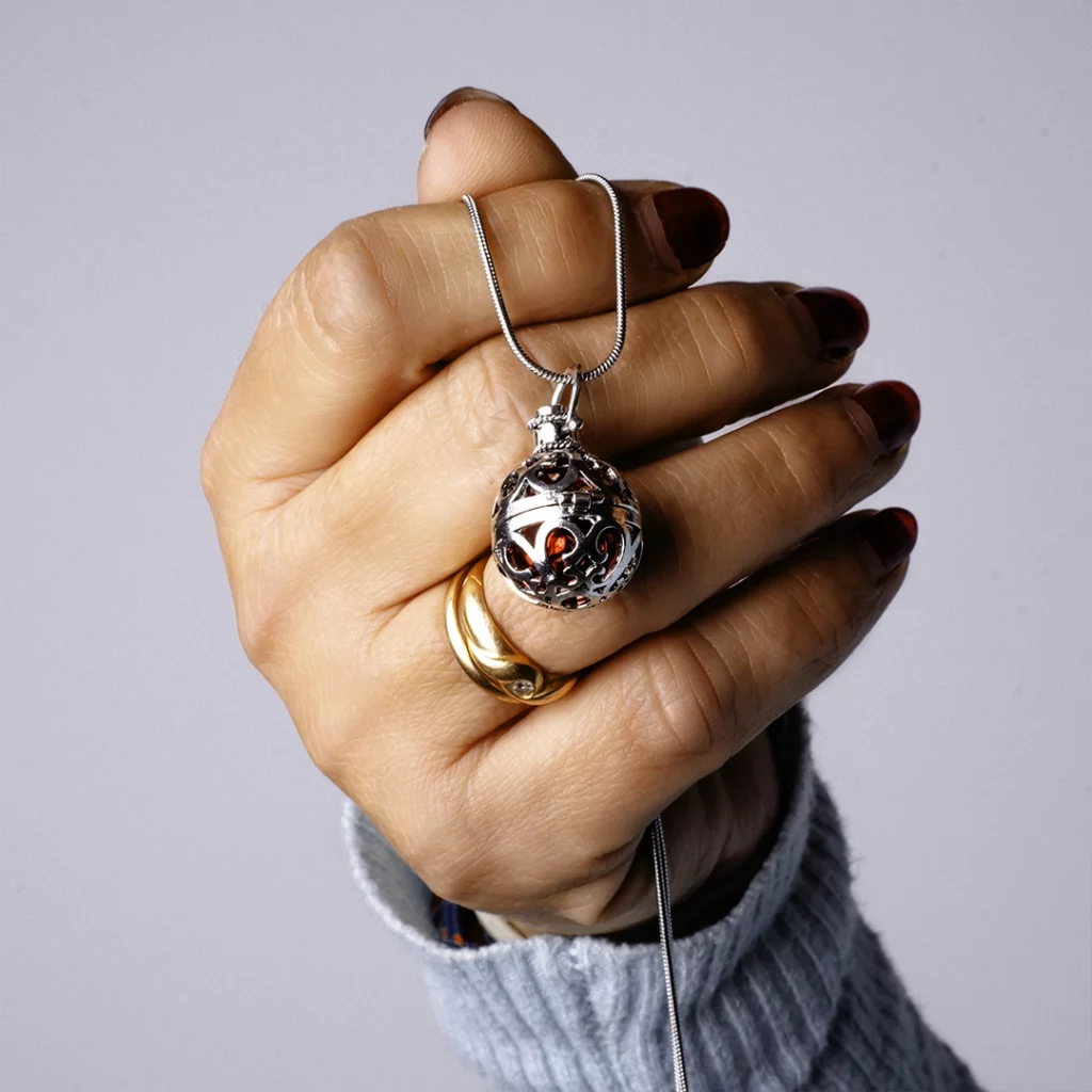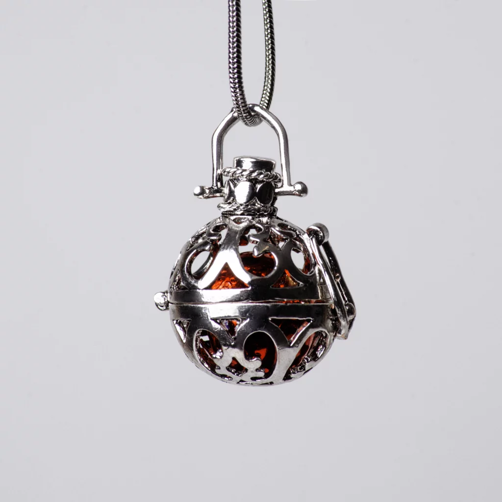 Contiene una pequeña bola que, al moverse, produce un sonido suave pensado para atraer a los ángeles guardianes y ofrecer protección.