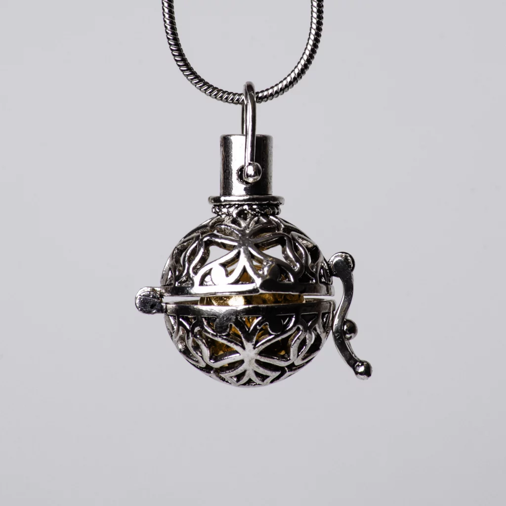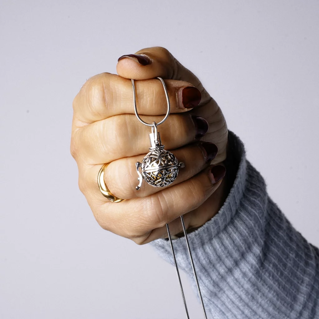 Contiene una pequeña bola que, al moverse, produce un sonido suave pensado para atraer a los ángeles guardianes y ofrecer protección.